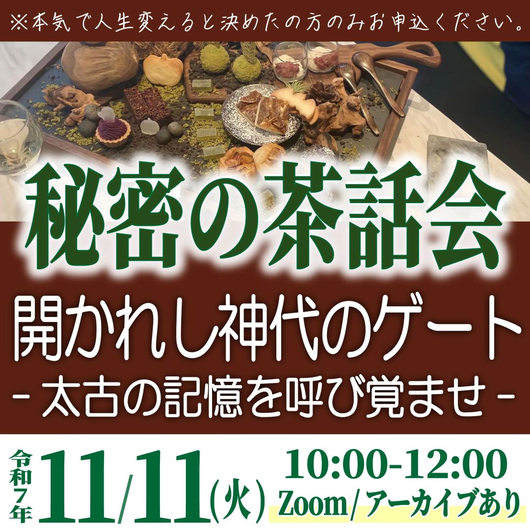 令和7年11月11日 門が立つ日に開催する 秘密の茶話会は 開かれし神代のゲートについて お話をいたします。 神代と人代の交代が始まり 開いた神代へのゲートをくぐる時が いよいよやってきました。 神代のゲートのくぐり方 しっかり確認いたしましょう。 開催概要 ▼日時▼ 令和7年11月11日(火) 10:00-12:00 後日アーカイブ配信あり ※11/11-11/17にお申込みの場合は アーカイブのみのご提供となります。 ▼参加条件▼ 己の中の神を興すと決めた人 神代の世界に移行すると決めた人 親星からのメッセージを受け取りたい人 ▼茶話会のテーマ▼ 開かれし神代のゲート ー 太古の記憶を呼び覚ませ ー